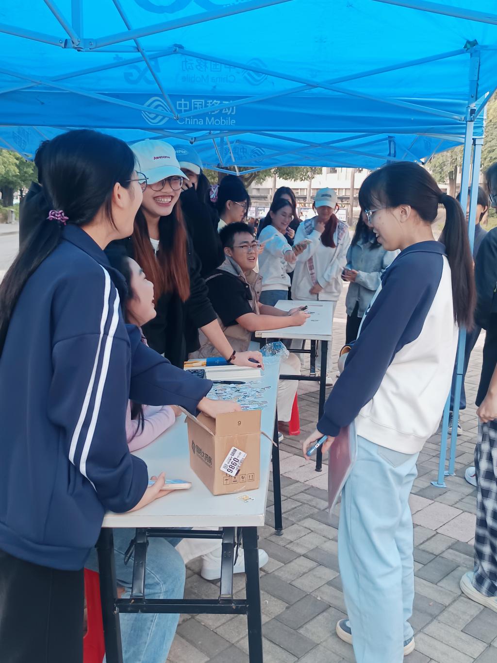 活动现场设有两个互动服务摊位,分别推出“单词盲盒挑战”“听力猜猜乐”和“趣味问答”三项任务。参与者可自由选择任务完成,累计积分兑换精美礼品。活动设计注重“低耗时、高趣味、强流动性”,有效降低了参与门槛,吸引了不少同学及小朋友驻足尝试。志愿者们积极引导,鼓励大家开口表达,在轻松互动中提升英语应用能力与表达自信。